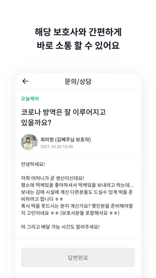 전화나 대면 상담이 어렵다면 모바일 상담을 받아보는건 어때요? 보호자는 간편하게 모바일로 문의를 할 수 있고, 요양원/주야간보호센터는 하나의 기기로 언제 어디서든지 보호자의 문의를 실시간으로 확인하고, 답변할 수 있어요