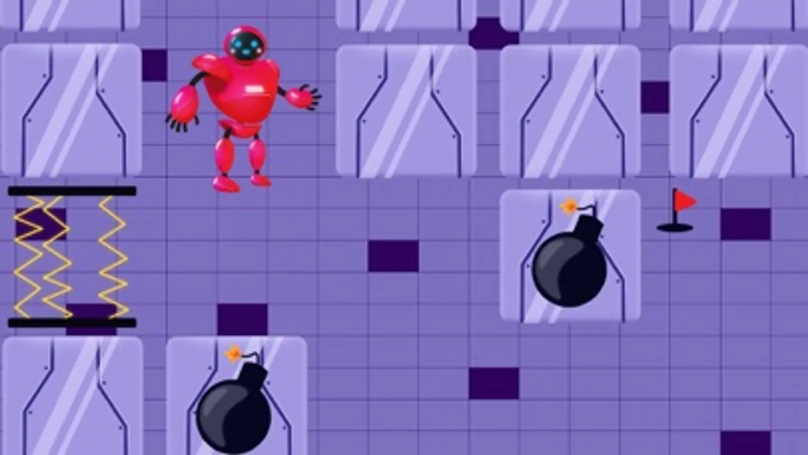 Planet of robots is a game, but still, they created another inhabitant of a new world, now we need to program our android and teach him to live in a new world of robots, dinosaurs, and small children of robots. When programming the robot, we will build a movement algorithm for a friend of girls and boys so that he does not fall into a trap. In the labyrinth of the robot factory, bombs and electric traps are waiting for us, but we will guide our little robot friend.