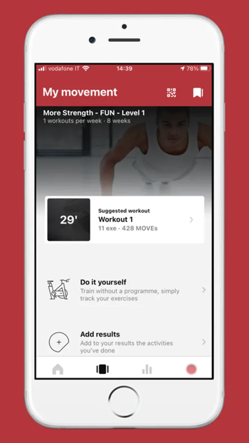hacer hoy en la página MÍ MOVIMIENTO y deje que la aplicación le guíe a través del entrenamiento: la aplicación se mueve automáticamente al siguiente ejercicio y le da la posibilidad de calificar su experiencia y programar su próximo entrenamiento.