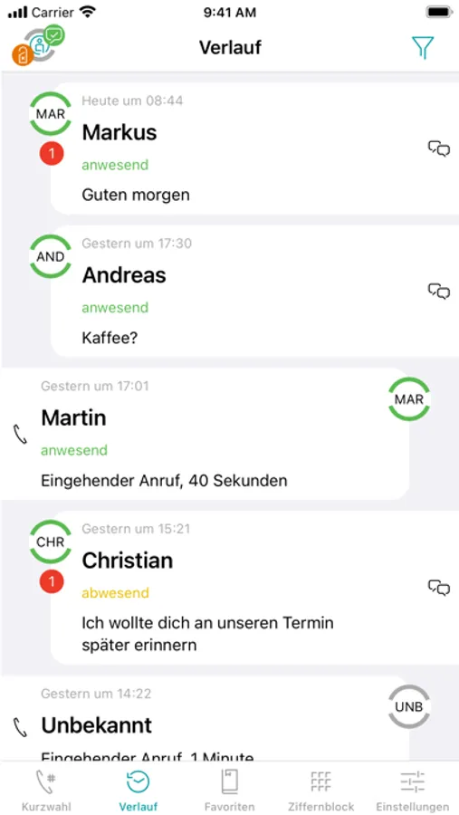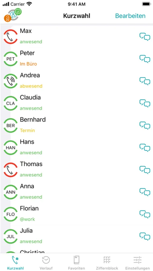 Der Benutzer kann auf die zentralen Telefonbücher der virtuellen Telefonanlage zugreifen, den zentralen Anrufbeantworter der Anlage am Smartphone abhören und sich alle geführten, sowie verpassten Anrufe seiner Büro-Nebenstelle anzeigen lassen. Des Weiteren kann der Benutzer den Online-Status seiner Kollegen jederzeit sehen, sowie Rufumleitungen mit dem Smartphone komfortabel aus der Ferne verwalten.