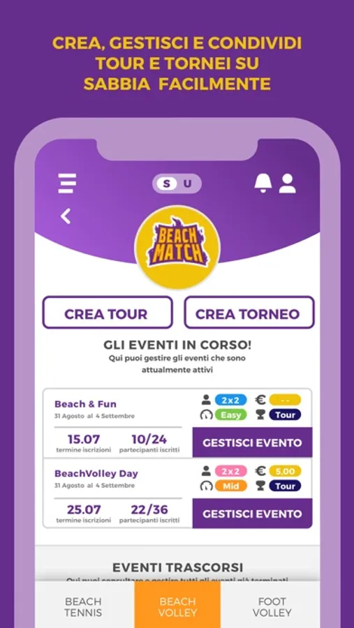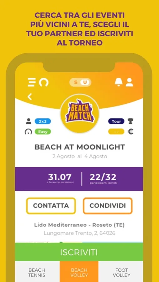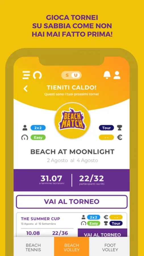 Nella tua pagina profilo, l’app ti mette a disposizione l’intero storico dei tuoi tornei sempre consultabili e l’indicatore del tuo Beach Power, una magica funzione che aggiornerà il tuo livello di gioco dopo ogni torneo, spingendoti a dare il massimo negli allenamenti settimanali per migliorare i tuoi risultati.