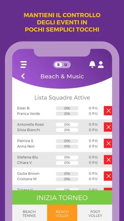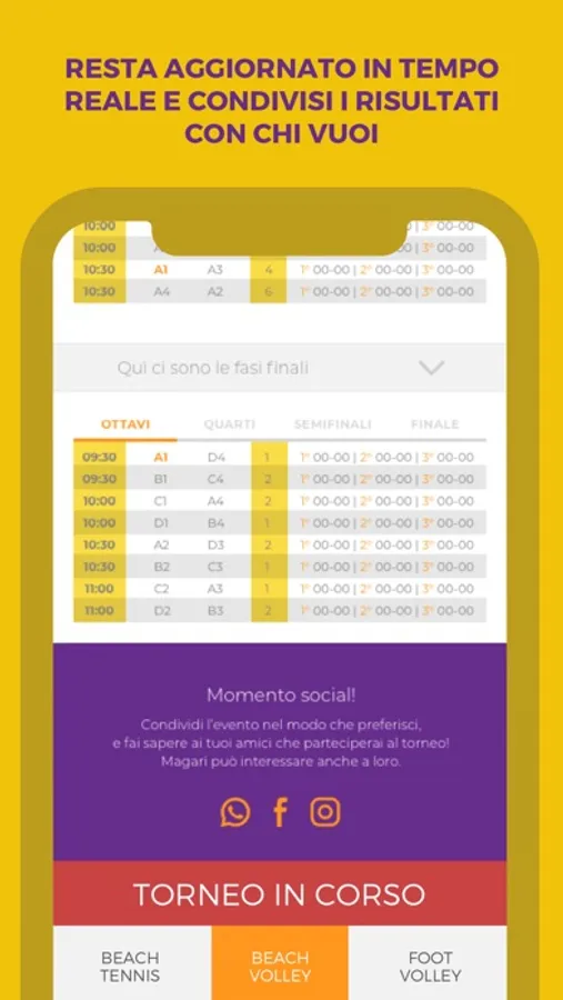 Durante l’evento avrai sempre a portata di mano orari di gioco, campo assegnato e risultati in tempo reale da condividere sui tuoi canali social.