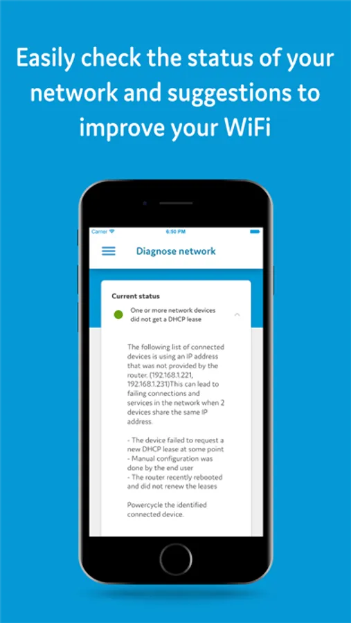 Or simply check the status of your network and see: What devices are connected to which access point, what is the status of each access point (e.g., is the connection good or bad) and receive solutions to improve your network or check what device is consuming the most data.