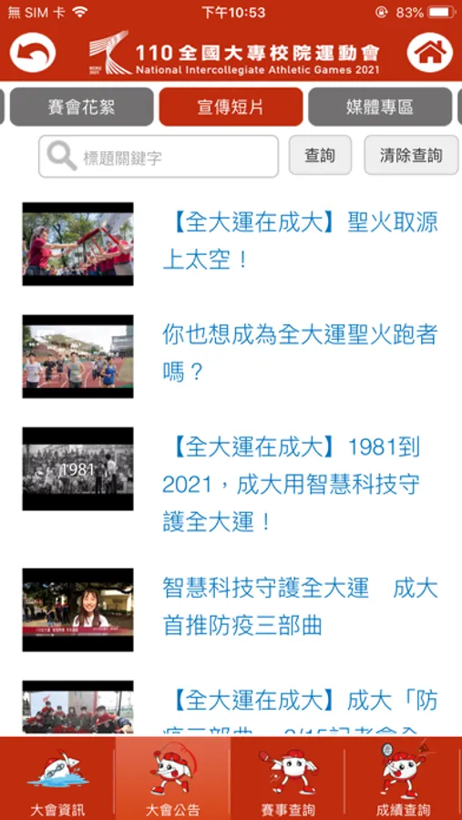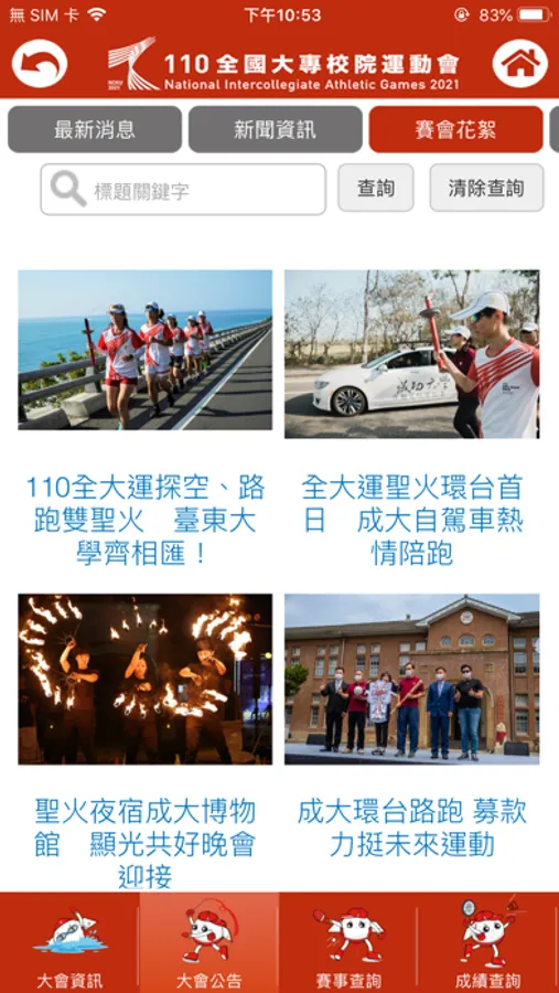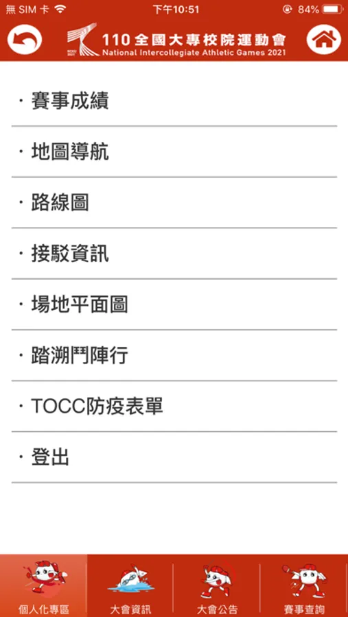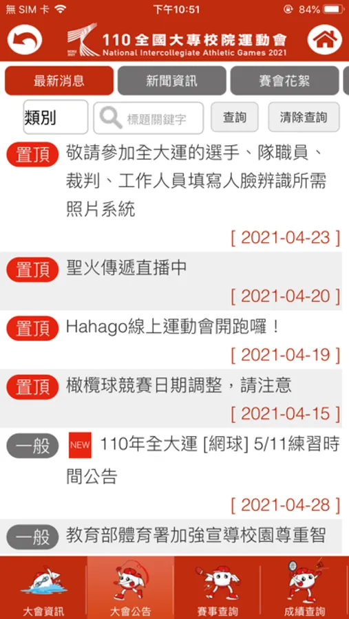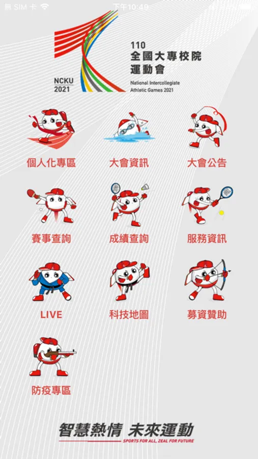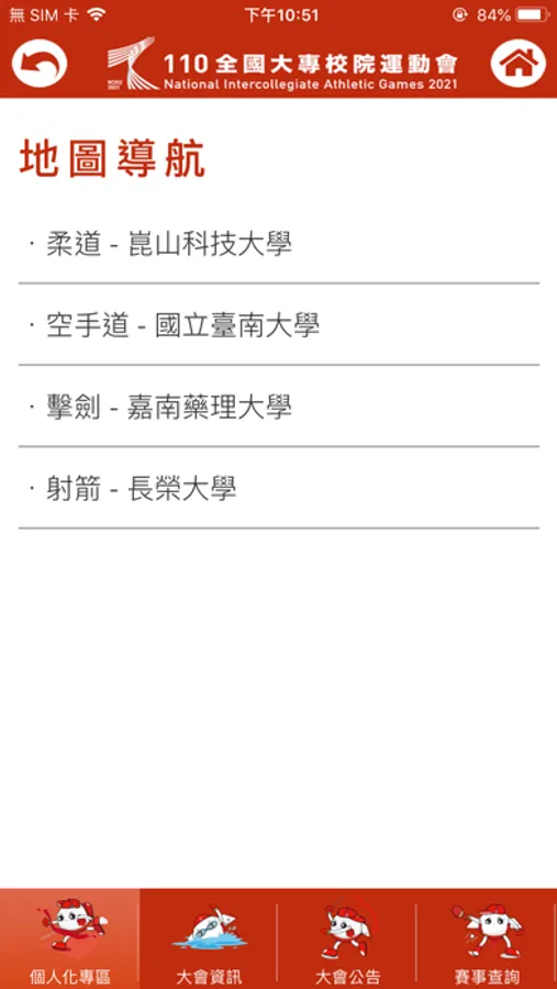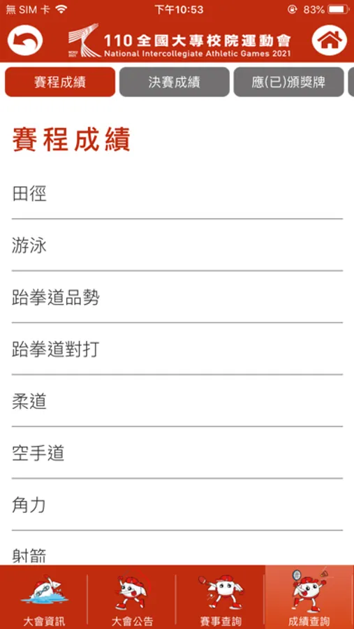 競賽種類:田徑、游泳、體操、桌球、羽球、網球、柔道、跆拳道、射箭、擊劍、舉重、射擊、拳擊、空手道、橄欖球、軟式網球、角力、木球。