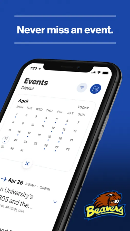 The event section shows a list of events throughout the district. Users can add an event to your calendar to share the event with friends and family with one tap.