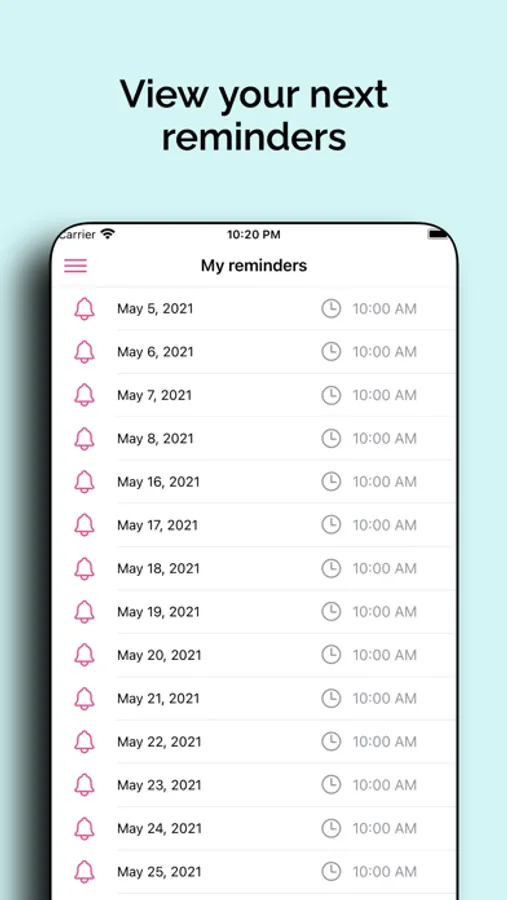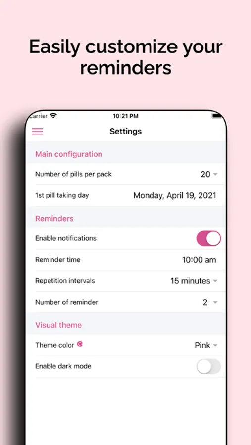 Pill reminder allows you to set the interval and number of repetitions of the reminders, until you have taken your birth control pill.