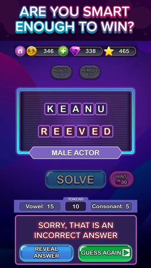 - Spend points to select letters one at a time, 15 points for vowels, and 5 for consonants!