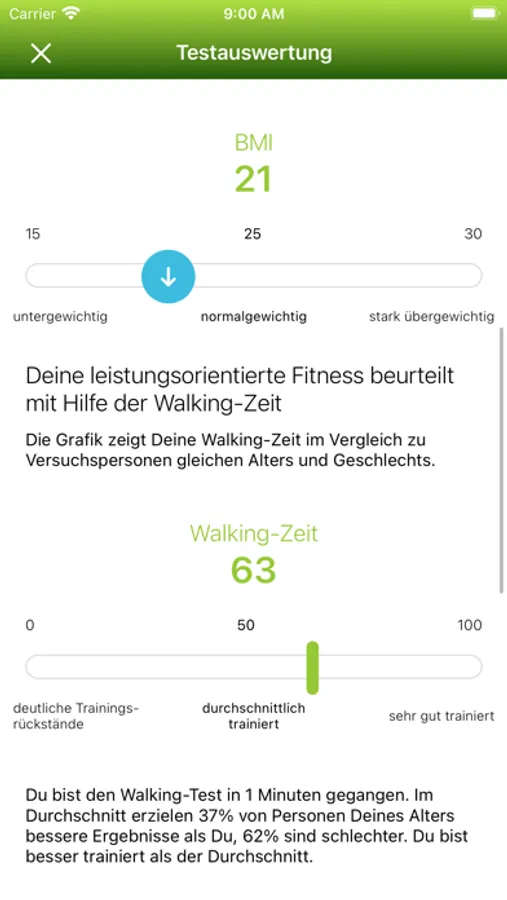 Für die Auswertung werden persönliche Daten wie Größe, Gewicht, Alter und Puls am Ende des Test-Walks benötigt. Sofern diese Daten über Apple Health verfügbar sind und der Zugriff vom Benutzer erlaubt wird, holt sich die App die Daten von dort.