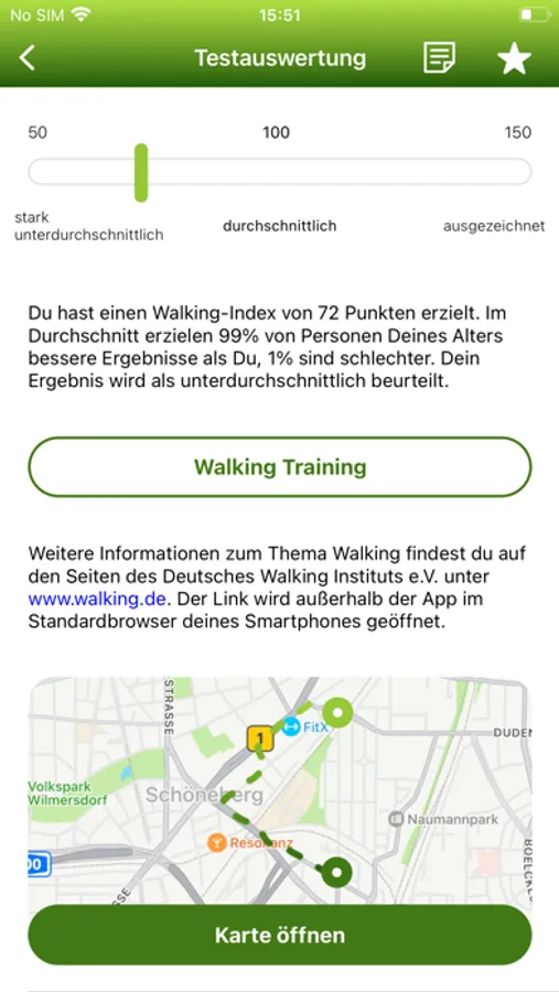 Du walkst eine möglichst ebene Strecke von zwei Kilometern. Die App misst die Zeit und per GPS die Distanz. Nach Abschluss des Tests kannst du noch deinen Puls eingeben. Das Ergebnis: ein persönlicher Walking-Index, ein Maß für die Ausdauer.