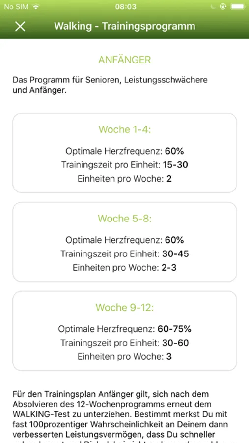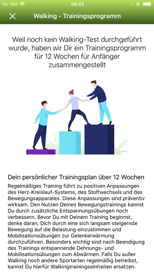 Auf Basis deiner Ausdauerleistung werden dir Trainingsprogramme vorgeschlagen. Du erhältst Empfehlungen, wie oft in der Woche du für wie viele Minuten mit welchem Puls trainieren solltest. Auch darüber hinaus bietet die App nützliche Informationen für Bewegungseinsteiger: von der idealen Ernährung bis hin zum Vorbeugen von Muskelkater.