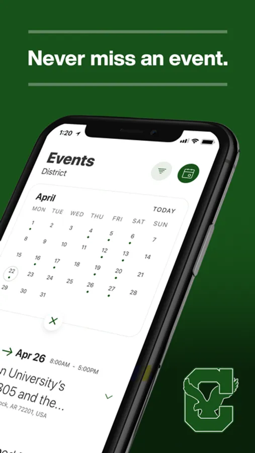 The event section shows a list of events throughout the district. Users can add an event to your calendar to share the event with friends and family with one tap.