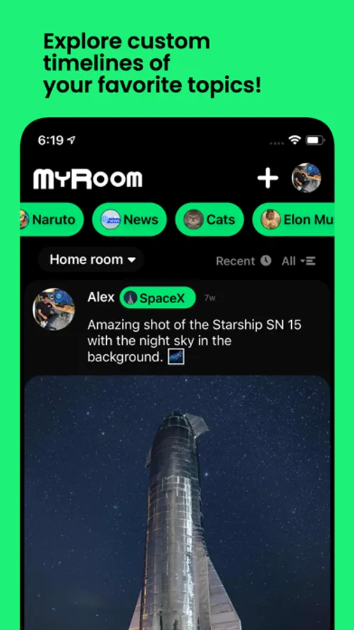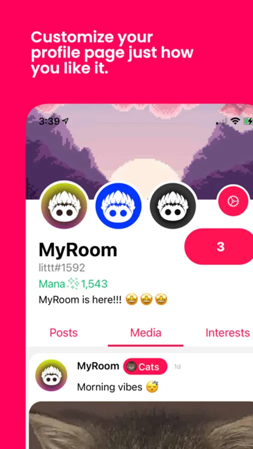 MyRoom is where topics and interests are sorted by rooms. These rooms are timelines that contain posts of your favorite topics. View all your topics inside the home room, or dive into specific ones!