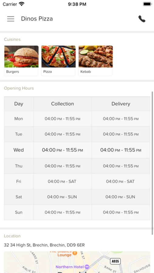 Order food online in Brechin! It's so easy to use, fast and convenient. Try our new, online app which contains our entire takeaway menu. The Dinos Pizza is located in Brechin.