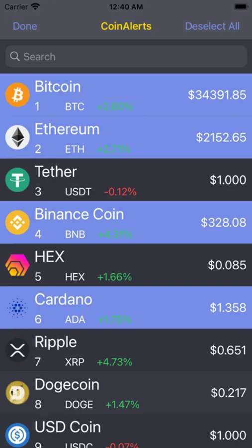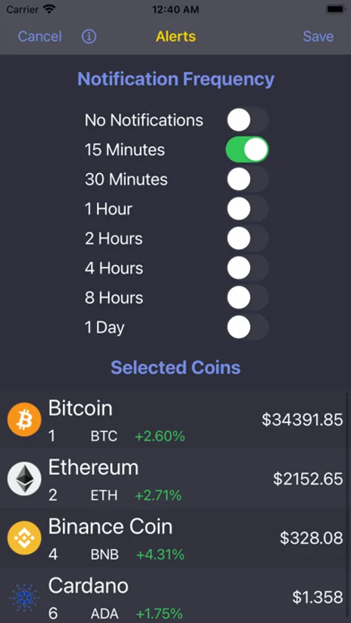 CoinAlerts Pro delivers price notifications for your favorite cryptocurrencies in the form of iOS push notifications. Gone are the days of checking your phone all the time to see what crypto is doing! With CoinAlerts Pro, just select your favorite coins and your desired notification frequency…then crypto prices will come to you!