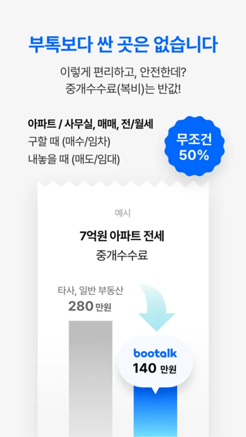 집 내놓을 때, 구할 때 모두 중개수수료(복비)가 무조건 반값, 50% 할인! 부톡 보다 싼 곳은 없습니다.