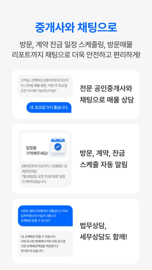 방문-계약-잔금 일정 조율은 물론, 오늘 본 매물리포트까지! 국내 유일 중개 전용 메신저로 안전하고! 편리하게!