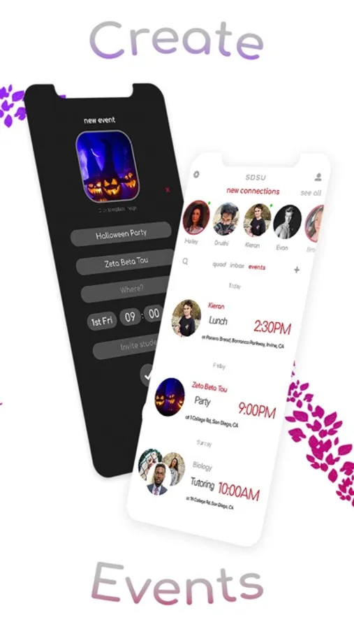 Events - Create events and invite students. Manage your invitees through the event’s quad (group), keep college lively and happening!