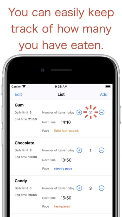 Once you have registered, the information you have registered will be displayed in the list. When you have eaten, you can manage the number of food you have eaten by pressing the plus button on the list. If you accidentally press the plus button, you can use the minus button to reduce the number.