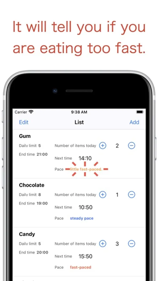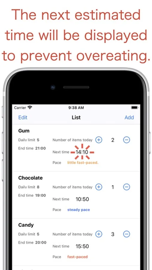 Register the "name," "daily limit," and "end time" of the food you are eating while studying or working.