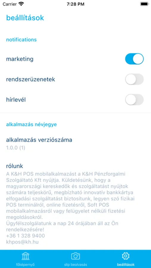 A mobilapplikáció letöltésekor Önnek lehetősége van hozzájárulását adni ahhoz, hogy telefonkészülékére értesítéseket küldjünk. Kiválaszthatja, hogy csak a K&H bankkártya elfogadás szolgáltatással kapcsolatos ún. rendszer működéssel, leállással, szoftverfrissítéssel kapcsolatos hírekről, információkról tájékoztassuk és/vagy a szolgáltatással kapcsolatos marketing jellegű, aktuálisan kínált kedvezményeinkről szóló üzeneteket is szeretné megkapni. Az értesítő üzenetek küldésére vonatkozó beállításokat a mobilapplikáción belül bármikor módosíthatja.