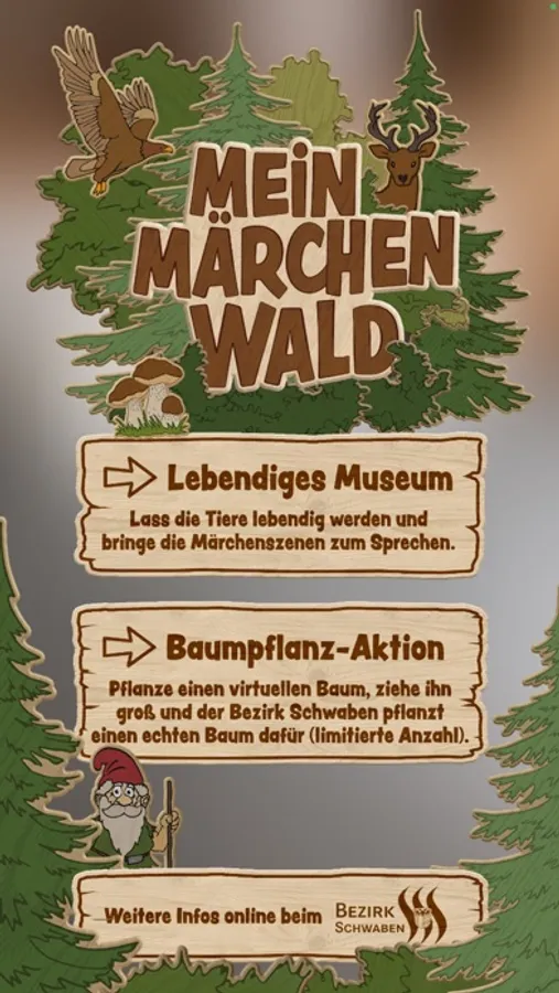Auch wenn die Ausstellung „MärchenWald“ des Bezirks Schwaben in Schloss Höchstädt gerade nicht geöffnet haben sollte, könnt ihr euch mit der zugehörigen App den Märchenwald einfach nach Hause holen.