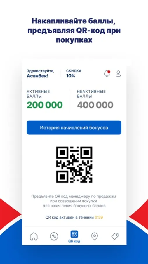 • Полный доступ к истории Ваших покупок и накопленных бонусов. Для начисления бонусов предъявите QR код менеджеру при оформлении заказа.