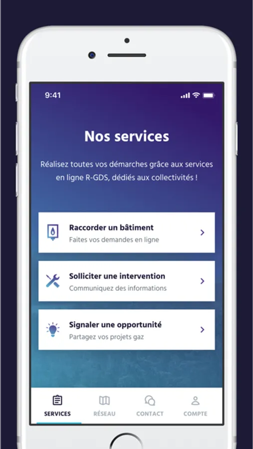 Dédiée aux collectivités, l’appli R-GDS vous propose des services en ligne adaptés à vos besoins. Raccorder un bâtiment, signaler une opportunité ou encore solliciter une intervention sur votre commune, n’attendez plus pour nous transmettre toutes vos demandes !