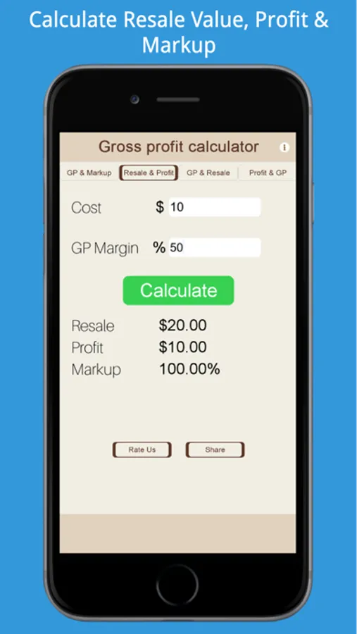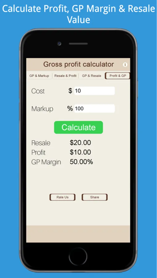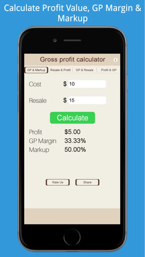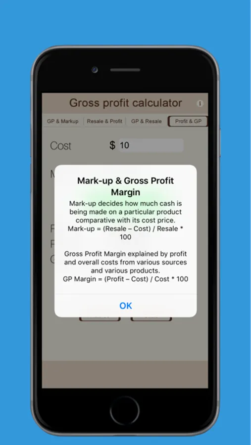 Definitions and equations for Mark-up percentage and GP Percentage is explained by clicking on Info icon in App. This will solve Many people’s confusion between Mark up and GP.