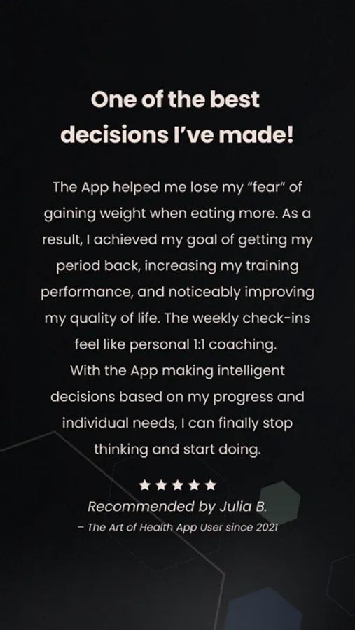 We strongly believe that everyone possesses a huge physical and mental potential that remains untapped. Our vision is to help you recognize this potential and make full use of it. We support you during your transformation and reach the best health and life quality possible together. Why can we do this? We developed an algorithm called The Art of Health app that makes personalized decisions for you based on scientific evidence. This algorithm takes into account your personal health factors such as sleep, stress level, energy & performance and hormonal changes and provides you with weekly adjustments such as adaptations of your calorie intake.