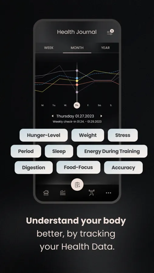 • Use the health journal to track your progress in terms of health data such as weight, sleep, stress level, digestion and ovulation