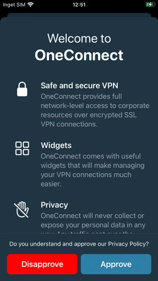 Clavister OneConnect provides users full network-level access to corporate resources over encrypted SSL VPN connections. Using Apple's Packet Tunnel Provider Network Extension, Clavister OneConnect client provides anytime, anywhere access to critical applications such as email, virtual desktop sessions and other applications protected by a Clavister NetWall Next-Generation Firewall (NGFW). Combined with Clavister OneTouch it also offers easy to use two factor authentication (2FA).