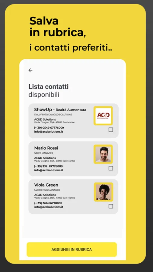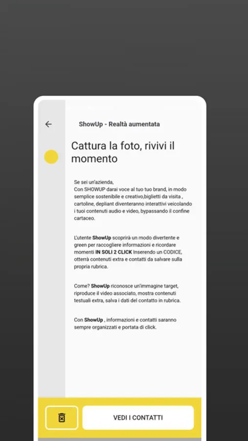 ShowUP AC&D is the app that uses image recognition technology to restore human depth to the traditional paper business card. In fact, the traditional business card reduces the complexity of a professional identity to a title and its contact details.