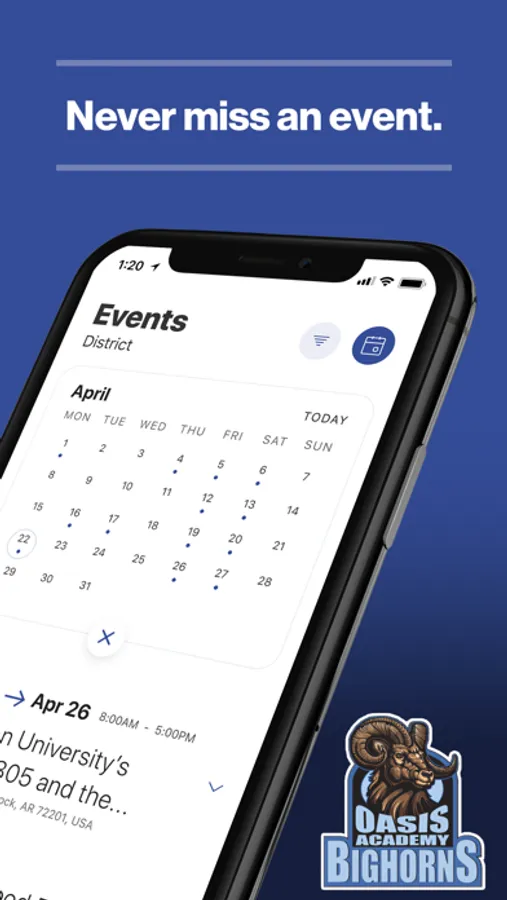 The event section shows a list of events throughout the district. Users can add an event to your calendar to share the event with friends and family with one tap.