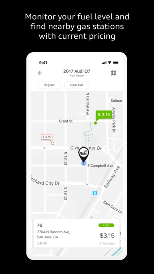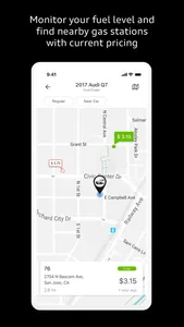 Easily monitor your car’s fuel level and get a list of nearby gas stations, sorted by price or distance.