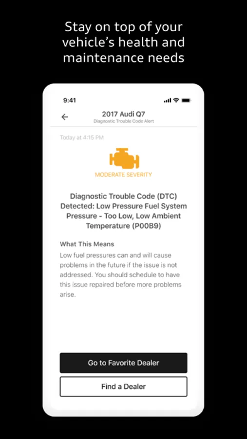 Keep an eye on your vehicle’s health in the app. If something happens, such as a diagnostic issue, you’ll be notified and provided with helpful information.