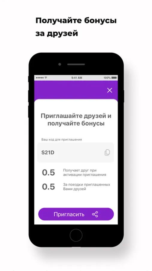 Приглашайте друзей в приложение и зарабатывайте бонусы с помощью реферальной системы. Оплачивайте ими и экономьте на поездках.