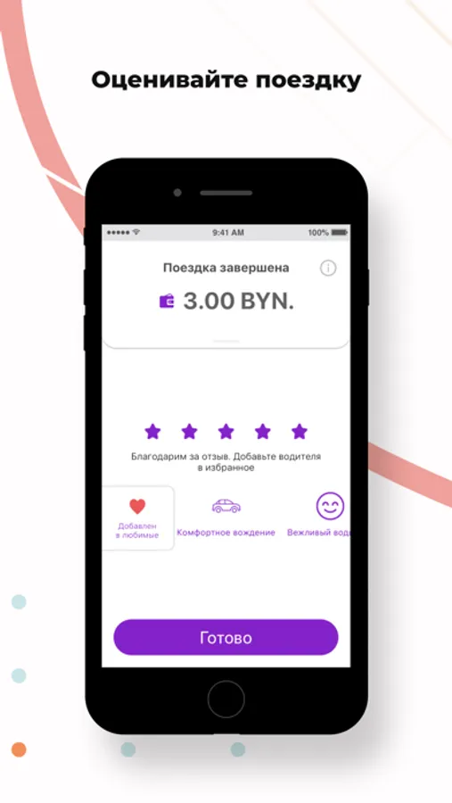 Поставьте оценку водителю, напишите отзыв или выберите реакцию из готовых шаблонов. Прикрепите фотографию к отзыву, оставьте чаевые или посмотрите детализацию платежей после поездки.