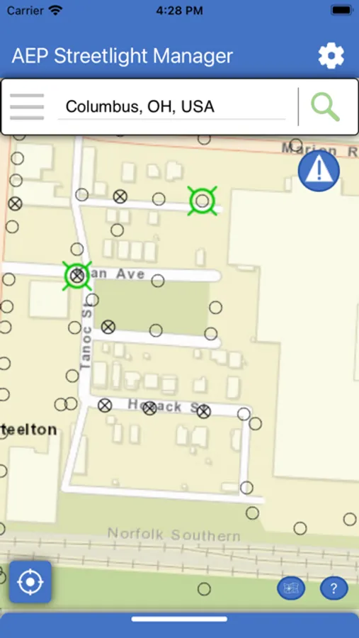 The AEP Streetlight Manager allows users to report light issues and problems to AEP. It also allows users at AEP partner companies to log in and manage lights associated with contracts that they currently have with AEP. The application features a map that includes the locations of poles and lights allowing the user to select a light that is having an issue.