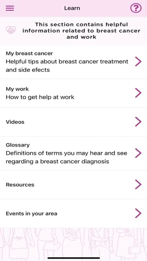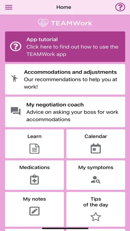 The TEAMWork app is designed to promote better communication between breast cancer patients and their employers and between breast cancer patients and their healthcare teams. This app contains helpful information for breast cancer patients to use during and after treatment.