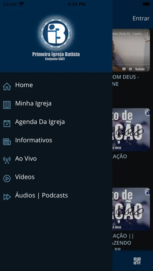 * 'Conteúdos (Áudio/Vídeo)': Permite visualizar e ouvir conteúdos da Igreja disponíveis no App;