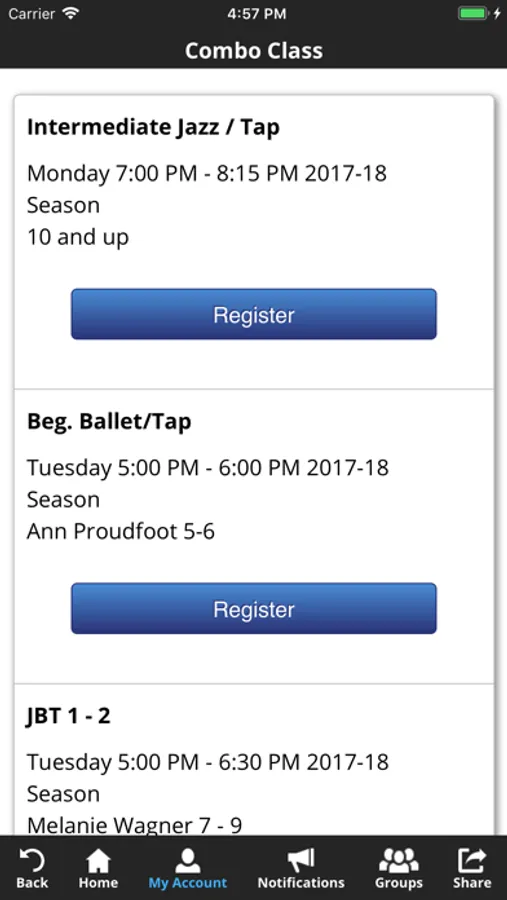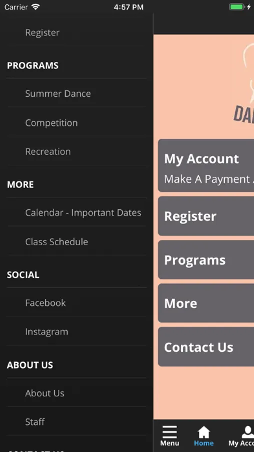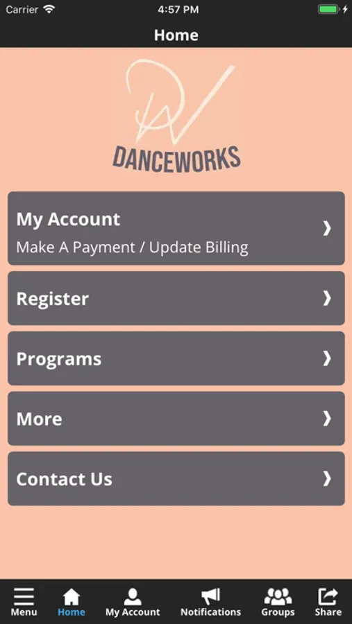 Welcome to DanceWorks Performing Arts Center! The DanceWorks PAC application allows dancers and parents to access important information with ease. With this app, you will be able to manage your account, access tuition information, receive notifications from the dance studio, connect with our social media, view our calendar, register for events, and communicate with team members and staff.