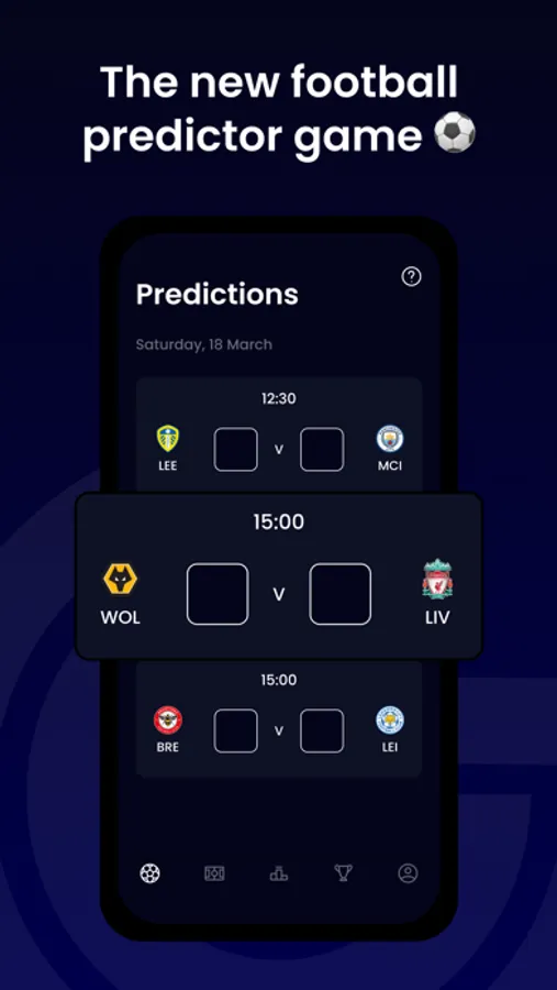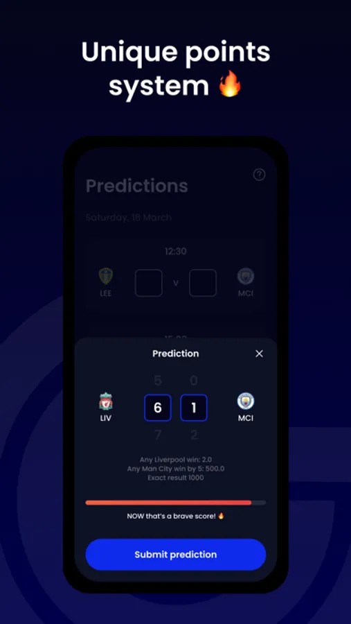 The aim of the game is to accumulate points by correctly predicting the outcome (home/draw/away), goal difference and exact score of real-world fixtures in your league. By offering more points for less-likely outcomes, the game encourages users to consider all possibilities when playing.