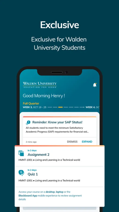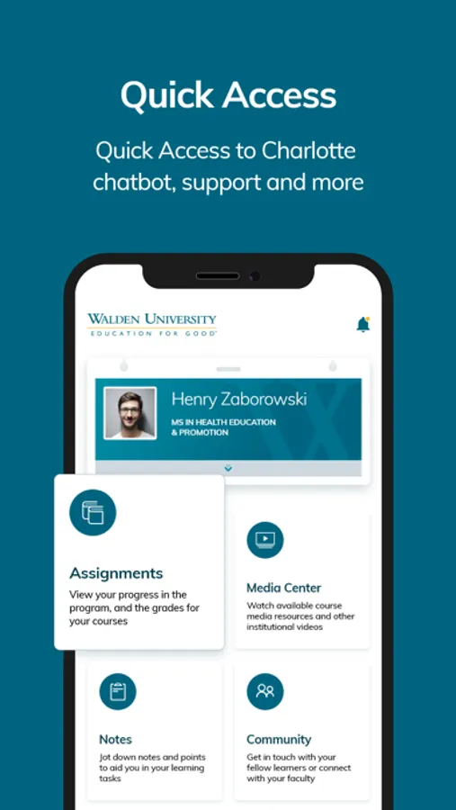 Walden Companion Mobile is a new app designed to help course-based students succeed at Walden University. Digital coach helps you through your to-do list, Walden's Charlotte chatbot is just a click away. Walden Mobile makes it easier to be on the go, keeping track of your courses, assignments, and grades from your phone.