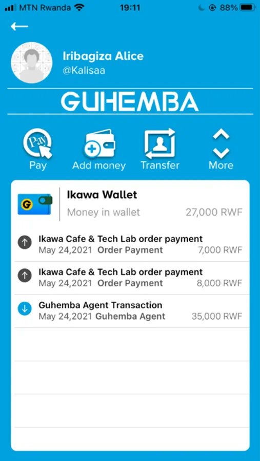 Guhemba also supports transferring MTN MoMo funds for 'Pre-Pay' to the Rooftop Ikawa Cafe.