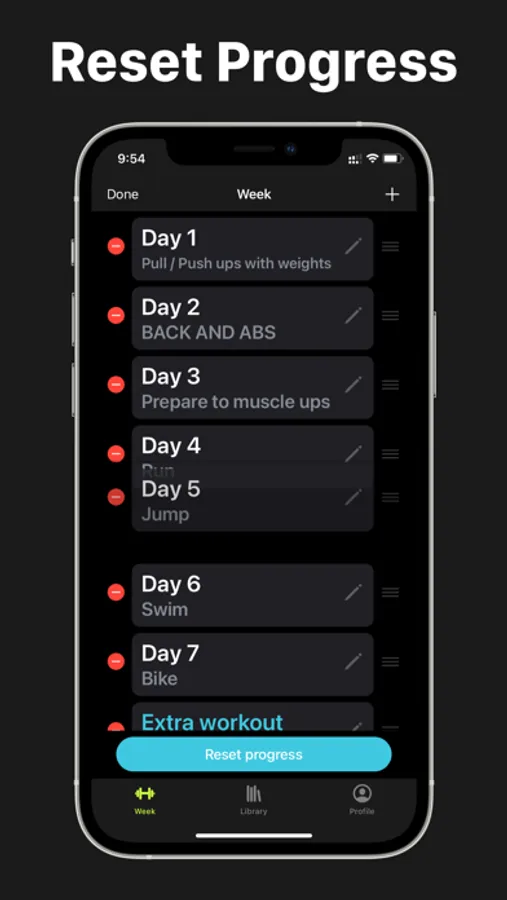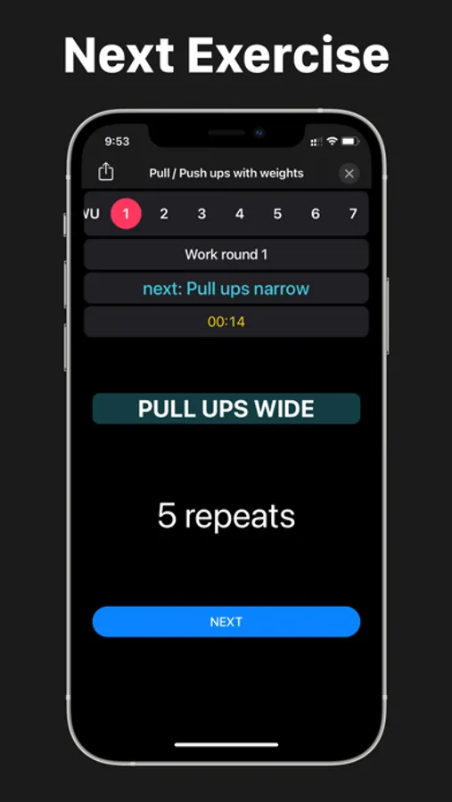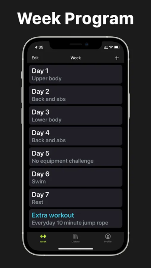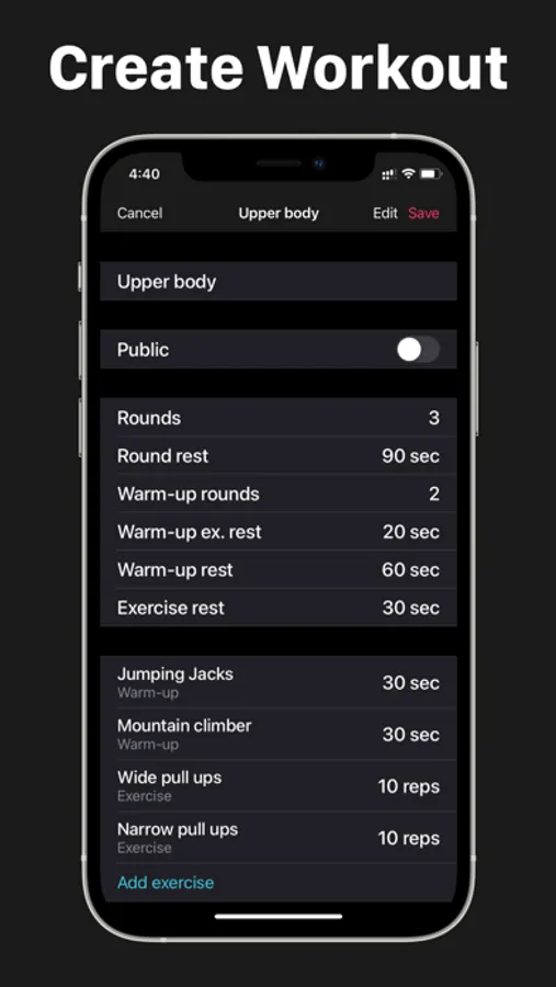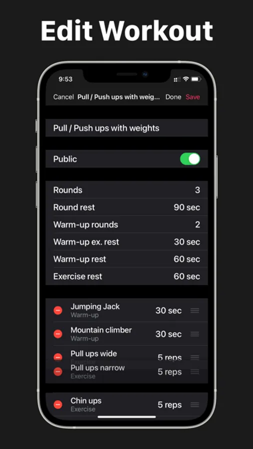 Create workout program easily for the whole week with warm-up, custom intervals, rest, rounds, etc. Edit the workout quickly if needed . Combine interval and reps exercises.