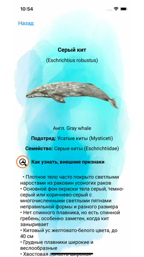 Мобильное приложение «Зачекинь кита» («Whale check in») – незаменимый помощник любителей морских путешествий, натуралистов и ученых при наблюдениях за обитателями морей и океанов. С помощью приложения, можно определить вид наблюдаемого животного и узнать много интересных фактов о нем.