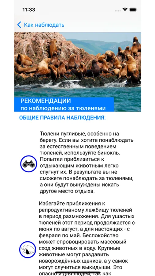 Приложение содержит рекомендации о том, как как правильно и безопасно наблюдать за китообразными и тюленями, чтобы не потревожить животных и не причинить им вред. А также рекомендации о том, как действовать при встрече с травмированным морским млекопитающим в воде или на суше.
