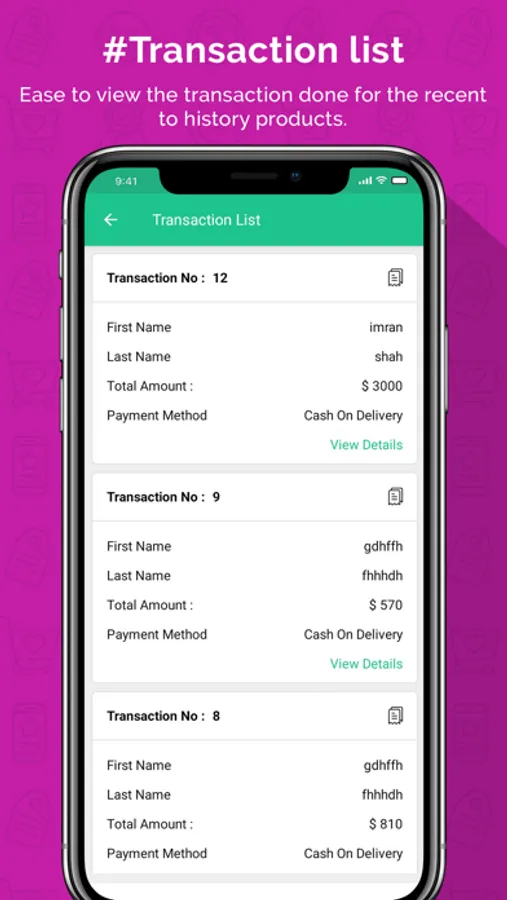 5. Transaction - User can see the list of the item ordered even can provide the rating or download the invoice within the application.