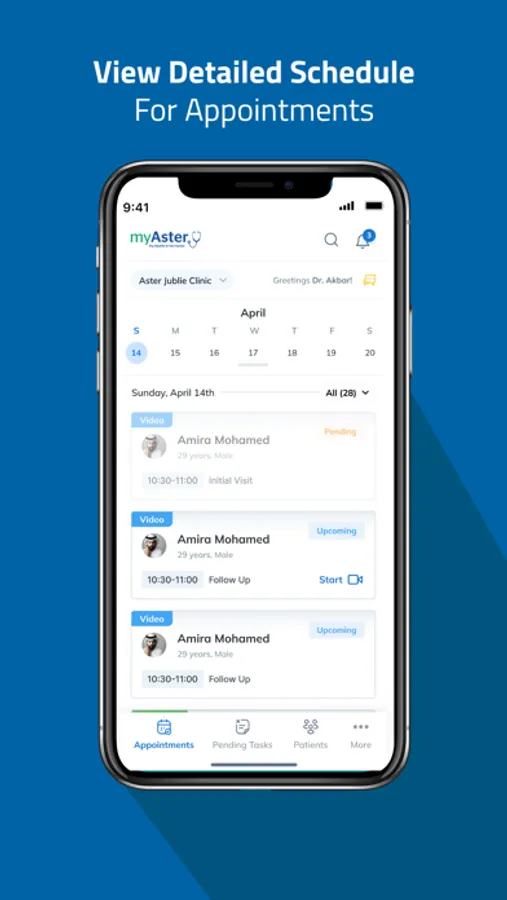 The 1Aster doctor app allows the doctors to view their entire schedule for the day, week and month. It also helps to identify the in-person and video appointments. Doctors can now easily raise a request for reschedules/cancellation to the admin ensuring all patients are informed well in advance.