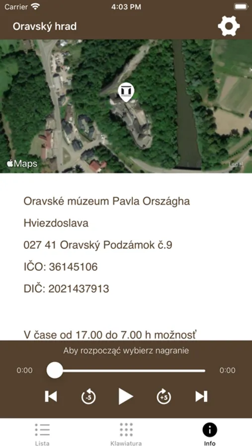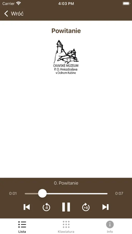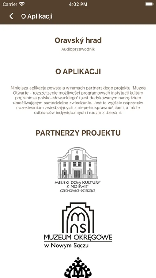 Niniejsza aplikacja powstała w ramach partnerskiego projektu "muzea otwarte - rozszerzenie możliwości programowych instytucji kultury pogranicza polsko-słowackiego" i jest dedykowanym narzędziem umożliwającym samodzielne zwiedzanie. Jest to wyjście naprzeciw oczekiwaniom zwiedzających z niepełnosprawnościami, a także odbiorców indywidualnych i rodzin z dziećmi.